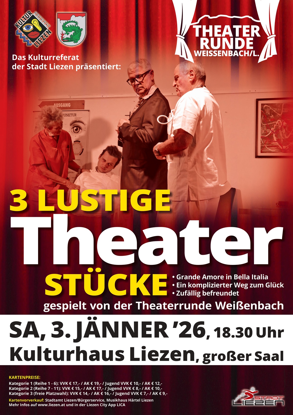 Das Kulturreferat Liezen und die Theaterrunde Weißenbach laden am 3. Jänner zu einer Aufführung in das Kulturhaus Liezen. Die Besucher erwartet wieder ein unterhaltsamer Abend mit lustigen Stücken des Ensembles. Mit gleich drei Einaktern - „Grande Amore Bella Italia", „Ein komplizierter Weg zum Glück" sowie „Zufällig befreundet"- servieren die Schauspielerinnen und Schauspieler einen kurzweiligen Theaterabend, bei dem kein Auge trocken bleibt. Ob italienische Leidenschaft, ob großes Herzklopfen, turbulente Urlaubsabenteuer- das Publikum bekommt wieder einmal alles geboten, was das Theaterherz begehrt.