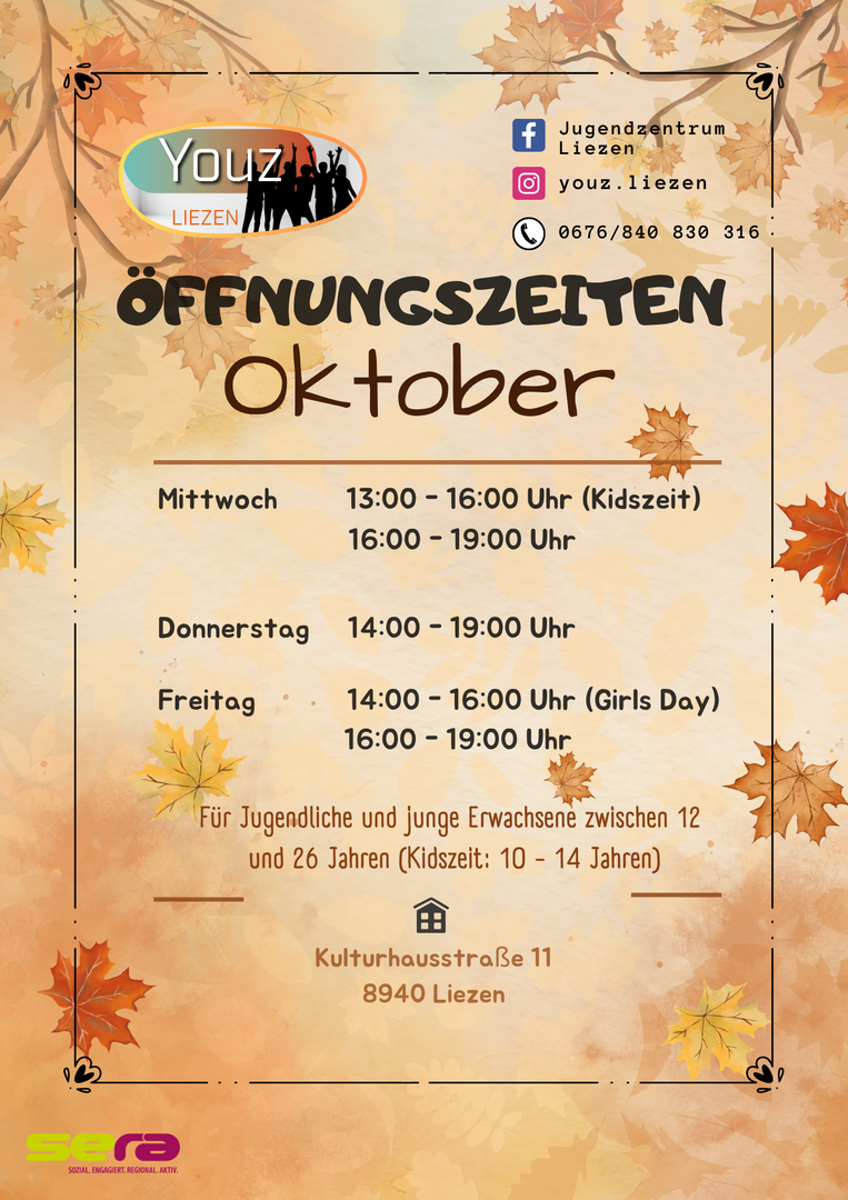 Nähere Informationen (Jugendzentrum Liezen) oder per E-Mail: youz@sera-liezen.at möglich.
